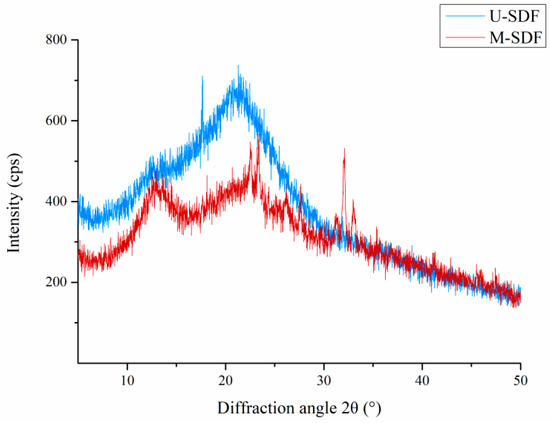 In order to study the crystal structure changes of SDF treated by mixed SSF, XRD analysis was carried out (Figure 3). The XRD patterns of the two samples were similar, with a characteristic wide diffraction peak at 23.4° 2θ for M-SDF and a characteristic diffraction peak at 22.3° 2θ for U-SDF. It showed that the two SDF samples were mainly amorphous structures [19]. Furthermore, the M-SDF sample possessed a new characteristic crystalline peak at 12.5° 2θ, indicating a significant change in the crystal structure of M-SDF after mixed SSF. By computing, the crystallinity of M-SDF (31.25%) was significantly higher than that of U-SDF (24.76%), which could be the degradation of crystal structure materials such as hemicellulose during mixed SSF, resulting in a more regular molecular arrangement and thus increasing the relative proportion of crystalline cellulose. In addition, changes in the crystal structure of M-SDF might affect its thermal stability and other functional properties.
