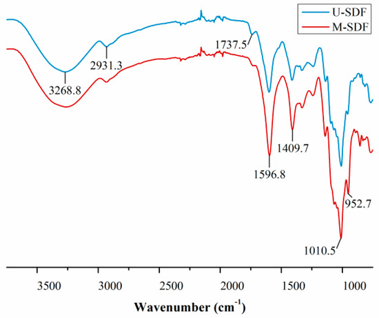The functional groups of U-SDF and M-SDF were determined using FT-IR spectroscopy. As shown in Figure 4, the spectral profiles of the two samples were similar in characteristics. Specifically, the broad and strong peak near 3268.8 cm−1 may be caused by the -OH bond vibration, which was related to the presence of water and hydrogen bonds in SDF [25]. There were weak absorption bonds in the vicinity of 2931.3 cm−1 and 1737.5 cm−1, suggesting that some methylene was presented in SDF samples. The absorption peaks near 1596.8 cm−1 attributed to the stretching of C=O bond, which suggested that both U-SDF and M-SDF samples contained uronic acid. The most interesting aspect of this graph was that the intensity of the C=O bond peak decreased dramatically in M-SDF compared to U-SDF, indicating a higher uronic acid content of the sample because of reconfiguration. The absorption peak at 1409.7 cm−1 is attributed to the C-H vibration of the aromatic lignin moiety. The absorption peak near 1010.5 cm−1 might be caused by ether bond stretching [26]. Additionally, the peak of M-SDF near 952.7 cm−1 suggested that the stretching vibration induced by β-glycosidic bond was enhanced after modification. Overall, the FT-IR spectra of U-SDF and M-SDF both showed characteristic absorption peaks of polysaccharides, and the functional groups of the two samples were similar. These results suggested that hydrophilic and other active groups in SDF would not change by mixed SSF.