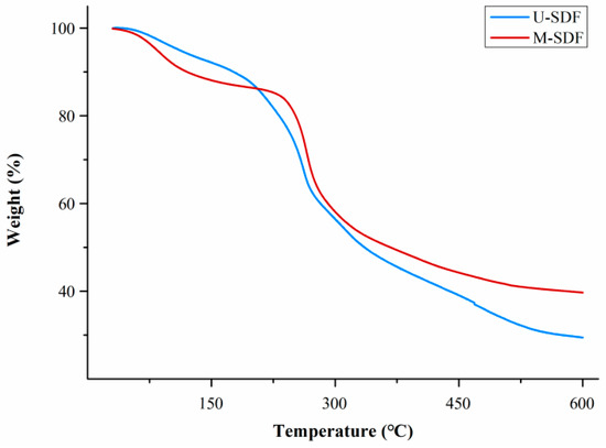 Thermal analysis could be employed to examine the thermal stability and composition of substances, which was regarded as an essential structural characteristic of SDF. The TGA curves of U-SDF and M-SDF were shown in Figure 5. From the picture, it could be seen that the thermal degradation of SDF included four stages: drying, pre-carbonation, carbonation, and combustion [11]. The temperature of the drying phase for SDF pyrolysis was below 150 °C. At this stage, the water absorbed by U-SDF and M-SDF was evaporated, which led to a slight decline in the weight of the sample. Among them, the faster mass loss of M-SDF indicated its comparatively positive water absorption [27]. When the temperature reached the range of 150–230 °C, it was the pre-carbonation stage, a slow process of the thermal decomposition of macromolecules into small molecules. As can be seen from Figure 5, the mass loss of M-SDF was minimal compared with U-SDF. Then the third carbonation stage was at the range of 230–300 °C. The weight was rapidly lost and the polysaccharide was thermally decomposed, which was because of the breakage of hydrogen bonds in the molecules and the degradation of SDF. According to the thermal analysis curve, it was obvious that the mass of M-SDF decreased severely. The temperature of the combustion stage was above 300 °C, the SDF residue was completely burned. Finally, the residual masses of U-SDF and M-SDF were 29.43% and 39.69%, respectively.