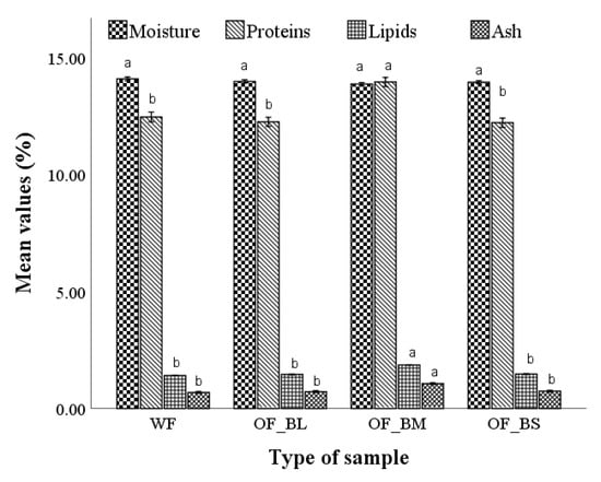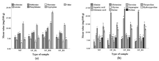 Considerably higher amounts for the following essential and non-essential amino acids compared to wheat flour were found: methionine (7.81–8.22%), threonine (3.30–3.42%), tryptophan (12.39–12.59%), valine (4.40–17.50%), alanine (4.26–5.69%), aspartic acid (1.85–6.19%), glutamic acid (8.50–18.36%), glutamine (21.88–24.09%), glycine (6.12–7.75%), serine (7.24–8.23%), tyrosine (3.97–5.55%), and asparagine (6.18–6.85%). Following the trend of nutritional composition and mineral content, also in the case of amino acid content, the highest values were observed in the OF_BM.