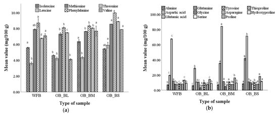 Amino acids: (a) essential, and (b) non-essential of the optimal breads. Mean values (n ≥ 2) with different letters (a–d) indicate significant differences (p < 0.05). Data are expressed on a dry basis.