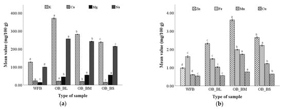 Macro- (a) and micro-mineral (b) composition of the optimal breads. Mean values (n ≥ 2) with different letters (a–d) are significantly different (p < 0.05). Data are expressed on a dry basis.