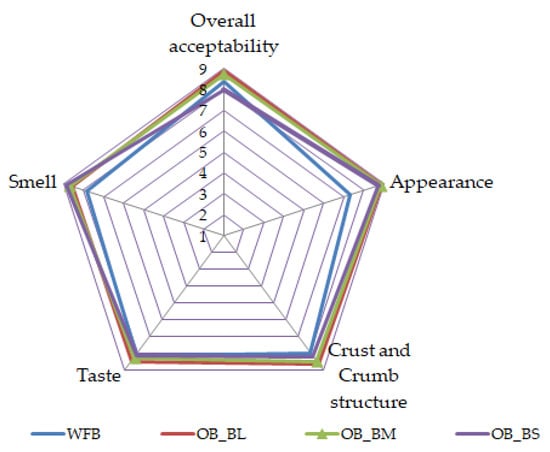 The sensory evaluation results highlighted a considerable effect of the optimal buckwheat flour of large, medium, and small particle sizes which partially substituted refined wheat on the bread sensory quality and overall acceptability. The optimal bread with large and medium particle sizes (OB_BL and OB_BM) presented a higher score for sensory characteristics evaluated compared to wheat flour bread (WFB) (Figure 5).