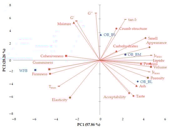Bi-plot for the principal component analysis performed for the dough dynamic parameters (▬), physical (●), chemical (▲), textural (■), and sensory characteristics (♦) of bread. ■ WFB—Wheat flour bread; ♦ OB_BL—optimal bread with large buckwheat flour particle size; ♦ OB_BM —optimal bread with medium buckwheat flour particle size; ▲ OB_BS —optimal bread with small buckwheat flour particle size.