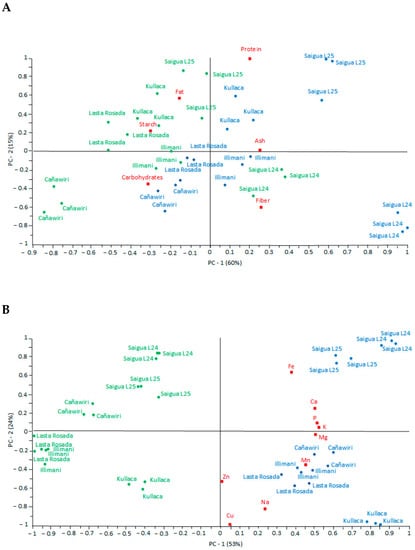 Principal component analysis (PCA) in Figure 3A showed 75% of the explained variance, PC—2 divided the whole (right) from the dehulled (left) grains, with the exception of Saigua L24, where even the dehulled grain is within the whole-grain group. The composition of the dehulled grains differs distinctly from whole grains.