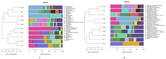 Cluster diagrams of breast milk and infant stools at the level of microbial genera and species. (A) The level of microbial genera. (B) The level of microbial species. (M: breast milk; F: feces).
