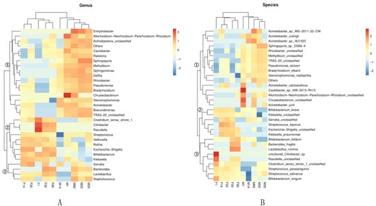 Heatmap of human milk and infant stools at the level of microbial genera and species. (A) The level of microbial genera. (B) The level of microbial species. (M: breast milk; F: feces; ①, ② and ③ represent three clades ).