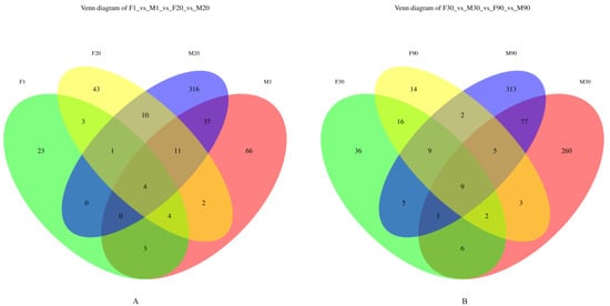 Venn diagrams of microbiota in human milk and infant stools. (A) Venn diagram of microbiota in human milk and infant stools on days 1 and 20. (B) Venn diagram of microbiota in human milk and infant stools on days 30 and 90. (M: breast milk; F: feces).