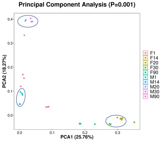 Principal component analysis of microbiota in human milk and infant fecal samples (M: breast milk; F: feces).