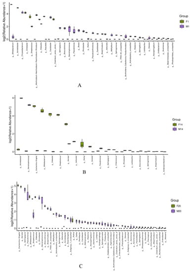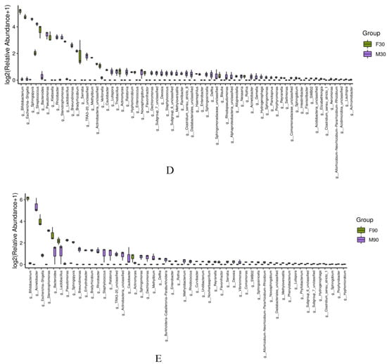 Box charts of microbiota in human milk and infant stools. (A–E): Box chart of microbiota in human milk and infant stools on days 1, 14, 20, 30, and 90. (M: breast milk; F: feces).