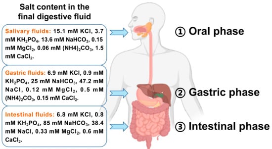 The digestion process and formulation of salivary, gastric, and intestinal fluids.