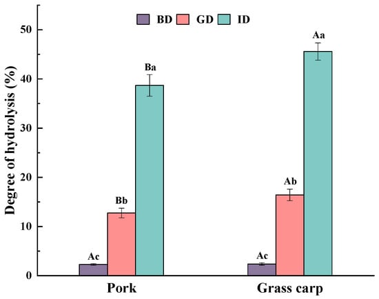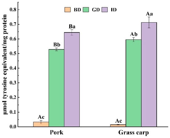 Changes in the TCA-soluble peptides content of pork and grass carp meat during digestion. BD, before digestion; GD, after gastric digestion; ID, after intestinal digestion. Different letters represent significant differences in TCA-soluble peptides content for different types of meat (capital letters) and different stages of digestion (lowercase letters) (p < 0.05).
