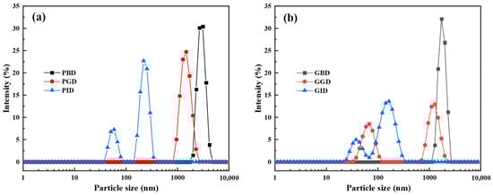 (a) Particle size distribution of pork before digestion (PBD), after gastric digestion (PGD), and after intestinal digestion (PID); (b) Particle size distribution of grass carp before digestion (GBD), after gastric digestion (GGD), and after intestinal digestion (GID).