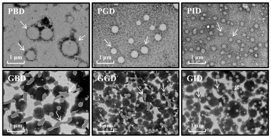 TEM images of the digestive juices of pork and grass carp meat at different stages of digestion. The white arrow indicates protein granules. PBD, pork before digestion; PGD, pork after gastric digestion; PID, pork after intestinal digestion; GBD, grass carp before digestion; GGD, grass carp after gastric digestion; GID, grass carp after intestinal digestion.