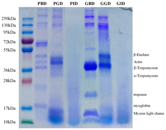 SDS-PAGE profiles of pork and grass carp meat at different stages of digestion. PBD, pork before digestion; PGD, pork after gastric digestion; PID, pork after intestinal digestion; GBD, grass carp before digestion; GGD, grass carp after gastric digestion; GID, grass carp after intestinal digestion.