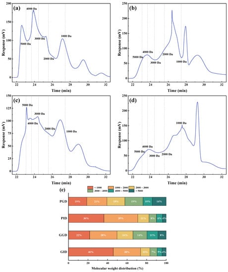 GPC chromatogram of (a) PGD, (b) PID, (c) GGD, and (d) GID; (e) the percentage of molecular weight distribution of peptides in the digestates of pork and grass carp at the end of gastric and gastrointestinal digestion. PBD, pork before digestion; PGD, pork after gastric digestion; PID, pork after intestinal digestion; GBD, grass carp before digestion; GGD, grass carp after gastric digestion; GID, grass carp after intestinal digestion. The location of the dotted line divides the range per 1000 kDa.