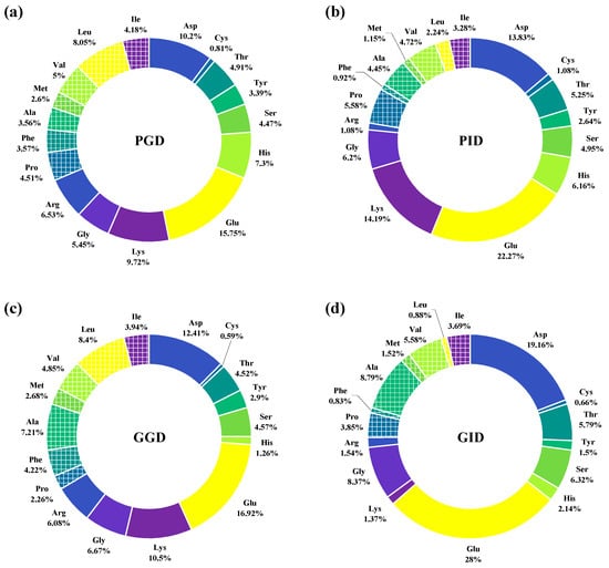 Amino acid composition of peptides in the digestive juices of pork and grass carp at the end of gastric and gastrointestinal digestion. (a): pork after gastric digestion; (b): pork after intestinal digestion; (c): grass carp after gastric digestion; (d): grass carp after intestinal digestion.