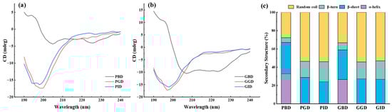 (a) Circular dichroism spectrum of pork at various stages of digestion; (b) Circular dichroism spectrum of grass carp at various stages of digestion; (c) Secondary structure content in the digestive juices of pork and grass carp meat at different stages. PBD, pork before digestion; PGD, pork after gastric digestion; PID, pork after intestinal digestion; GBD, grass carp before digestion; GGD, grass carp after gastric digestion; GID, grass carp after intestinal digestion.