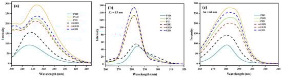 Synchronous fluorescence spectroscopy can obtain single characteristic fluorescence peaks of specific amino acids, allowing for a more precise analysis of tertiary structure changes in proteins. When Δλ = 15 nm, only the fluorescence spectrum of Tyr residues is displayed. As shown in Figure 10b, the fluorescence intensity of Tyr residues in PGD and GGD significantly increased after enzymatic hydrolysis, accompanied by a slight blueshift (3 nm and 2 nm). This may be due to the exposure of buried hydrophobic groups within the protein, leading to enhanced local hydrophobicity of the Tyr residues’ microenvironment [66]. After both gastric and gastrointestinal digestion, the two types of meat proteins exhibited almost identical characteristic fluorescence spectra, indicating that digestion does not have a specific differential effect on the Tyr residues’ microenvironment of the two proteins. At Δλ = 60 nm, only the fluorescence spectral characteristics of Trp residues were visible. Figure 10c shows that the characteristic spectrum of Trp residues changed similarly to the intrinsic spectrum, with an increase in fluorescence intensity and a red shift (3 nm). This is because Trp is the primary contributor to the protein’s fluorescence emission [67]. Therefore, some studies directly regard the intrinsic fluorescence spectrum of proteins as the spectrum of Trp residues [65,68].