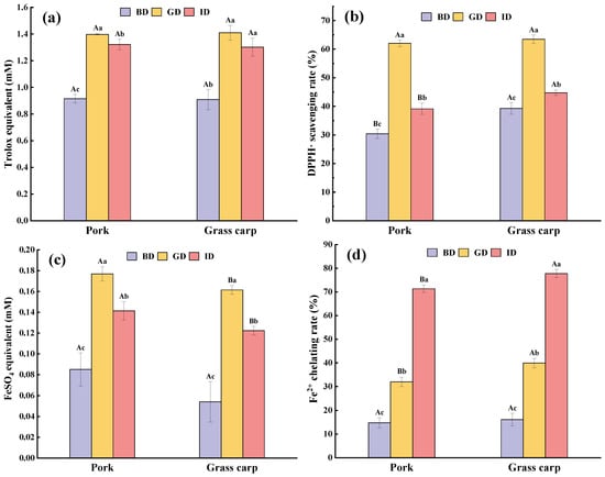 ABTS+· scavenging activity (a), DPPH· scavenging activity (b), Ferric reducing ability (c), and Fe2+ chelating ability (d) of the digestive juices of pork and grass carp meat at various stages of digestion. BD, before digestion; GD, after gastric digestion; ID, after intestinal digestion. Differences in capital and lowercase letters represent significant differences in the data for different types of meat and different stages of digestion, respectively (p < 0.05).