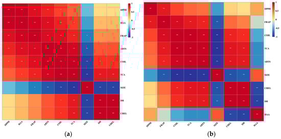 Heatmap of correlation analysis between different indicators for pork (a) and grass carp (b). Red represents positive correlation, blue represents negative correlation, and the intensity of the color reflects the size of the correlation coefficient. DPPH, DPPH· scavenging activity; HAA, hydrophobic amino acid; FRAP, Ferric reducing ability; ABTS, ABTS+· scavenging activity; COIL, random coil; TCA, TCA-soluble peptides; SIZE, particle size; DH, degree of hydrolysis; CHEL, Fe2+ chelating ability. The p value is marked with an asterisk (*) as p < 0.05, and two asterisks (**) are marked as p < 0.01.