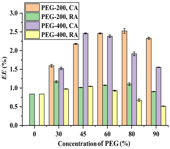 In the present work, PEG-200 and PEG-400 were used as extraction solvents, and their extraction ability for CA and RA is shown in Figure 1. It can be seen that when PEG-200 is used as extraction solvent, the extraction efficiency of CA increases with the increaseinPEG-200 concentration from 0% to 60%, remains stable from 60% to 80%, and decreases when further increasing to 90%, indicating that 60% of PEG-200 provides the highest CA extraction efficiency. A similar trend can be observed when using PEG-400 as extraction solvent: the extraction efficiency of CA increases with increasing the concentration of PEG-400 from 0% to 45%, stabilizes in the range of 45% to 60%, and decreases with further increasing the PEG-400 concentration. Therefore, a 45% PEG-400 yields the highest CA extraction efficiency, which is higher than the extraction ability of 45% PEG-200 and equivalent to the extraction ability of a 60% PEG-200, which may be attributed to the hydrophobic nature of CA [8,10] and the fact that PEG-400 is more hydrophobic than PEG-200 [23,24], i.e., the hydrophobic interaction between PEG-400 and CA is stronger than that between PEG-200 and CA, leading to PEG-400 having higher extraction ability for CA.