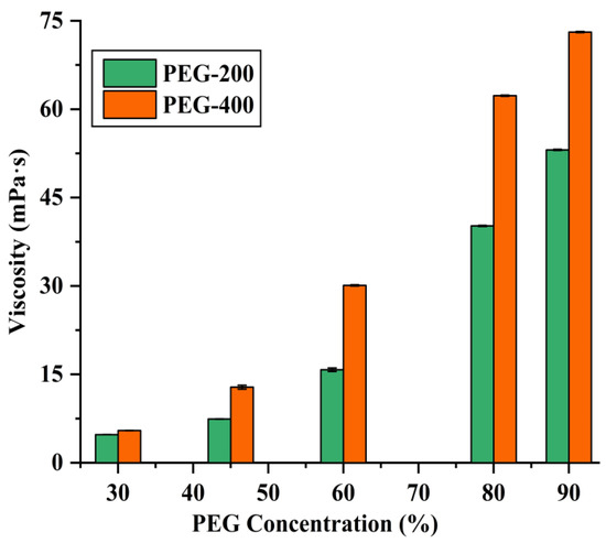 It is known that PEG has good solubility for organic compounds [25], with lower PEG concentrations enhancing higher extraction efficiencies of CA and RA, while high PEG concentrations (e.g., 90%) are unfavorable, which may be ascribed to the highly viscous properties of PEG. As illustrated in Figure 2, the viscosity of the PEG solution increases with the increase in PEG concentration. High viscosity means low mass transfer rate, which consequently leads to low extraction efficiency [26,27].