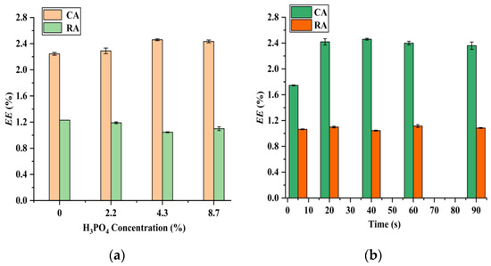Generally, for the extraction of bioactive compounds from plant tissues, the addition of mineral acids can enhance the extraction efficiency, because they can effectively disrupt the cell walls of plant tissues [28,29]. Furthermore, it has been reported that H3PO4 can stabilize CA [6], and the effect of H3PO4 dosage is therefore studied. The results illustrated in Figure 3a suggest that the extraction efficiency of CA increases with increasing H3PO4 concentration from 0% to 4.3% and remains roughly stable when above this level. The extraction efficiency of RA keeps constant with the H3PO4 concentration, varying from 0% to 8.7%. Based on this observation, 4.3% was selected as the optimal H3PO4 dosage and used in the following experiments.