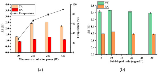 The effect of microwave irradiation power shown in Figure 4a demonstrates that the extraction efficiencies of RA and CA increase by raising the microwave irradiation power from 70 W to 280 W and decrease with increasing the microwave irradiation power to 420 W. Based on this observation, 280 W is regarded as the optimal microwave irradiation. It has been reported that RA and CA are thermally unstable: high temperature leads to their degradation [30,31]. Therefore, the decrease in the extraction efficiency at 420 W of microwave irradiation power may be ascribed to the fact that this microwave irradiation power gives the highest extraction temperature, as illustrated in Figure 4a. In addition, Figure 4b demonstrates that a solid–liquid ratio of 10 mg mL−1 possesses the highest extraction efficiency for both CA and RA, and it was thus selected in the subsequent experiments.