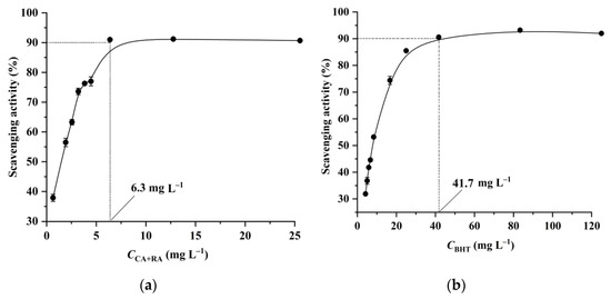 Generally, the DPPH radical scavenging activity is usually used to evaluate the antioxidant activities of plant extracts [21,22]. As shown in Figure 6, the PEG-400 extract exhibits a 90% DPPH radical scavenging activity at a concentration of 6.3 mg L−1 (total concentration of CA and RA in the PEG-400 extract), which is more effective than BHT (41.7 mg L−1). Additionally, PEG-400 is biodegradable with low toxicity [14,15,16]; therefore, the PEG-400 extract has potential applications as an antioxidant in the food industry.