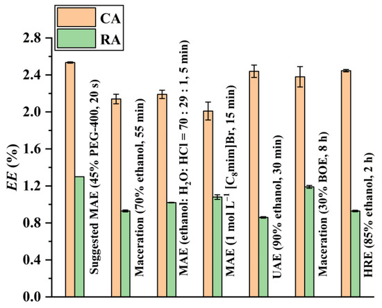 Recently, IL- or ethanol-based MAE [5,8], HRE [8], UAE [9], and maceration [6,7] techniques were used to extract CA and RA from ROLs. The extraction capacity of the developed PEG-400-based MAE was thus compared with these extraction methods. In order to ensure comparability of the experimental results, all reported extraction methods were performed under their optimal conditions. The results illustrated in Figure 7 indicate that the developed PEG-400-based MAE yields the highest CA and RA extraction efficiencies with the shortest extraction time. In addition, PEG-400 is environmentally friendly, as it is biodegradable with low toxicity [15,16].
