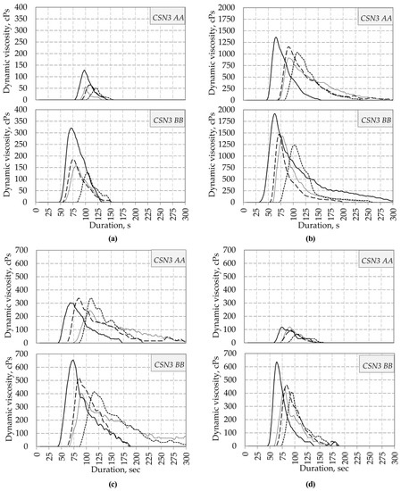 The data presented in Figure 4 and Table 4 confirmed the previously obtained patterns of the positive effect of the BB genotype on the CSN3 gene on the coagulation properties of not only milk but also the retentates obtained from it [23,26]. In all samples produced from milk obtained from cows with the CSN3 BB genotype, the duration of coagulation had the lowest values, while the viscosity during the formation of clots was the highest.