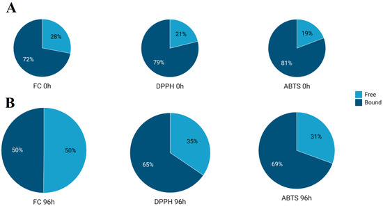 Ratio between values of free and bound fractions measured by FC, DPPH, and ABTS assays in nongerminated spelt (A) and 96 h germinated spelt (B). An increase in plot area represents a relative increase of measured values during 96 h of germination.