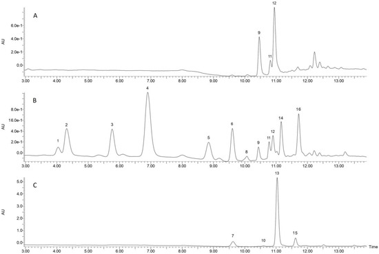 Chromatograms obtained through LC-MS analysis of (A) free fraction of nongerminated spelt, (B) free fraction of 96 h germinated spelt, and (C) bound fraction of 96 h germinated spelt. Peaks: 1–unidentified, (m/z 534.3); 2–unidentified, (m/z 388.2); 3–unidentified, (m/z 134.2); 4–unidentified, (m/z 418.2); 5–HBOA; 6–unidentified, (m/z 594.5); 7–trans p-coumaric acid; 8-BOA; 9–schaftoside structural isomer 1; 10–cis p-coumaric acid; 11–schaftoside; 12–schaftoside structural isomer 2; 13–trans ferulic acid; 14–unidentified, (m/z 432.4); 15–cis ferulic acid; 16–MBOA.