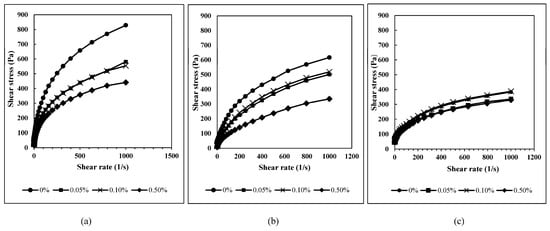 Effects of different GDL concentrations (●—0%; ■—0.05%; X—0.10%, and ♦—0.50%) on flow properties of different types of starch, (a) potato starch, (b) tapioca starch, and (c) corn starch, based on Herschel–Bulkley model.