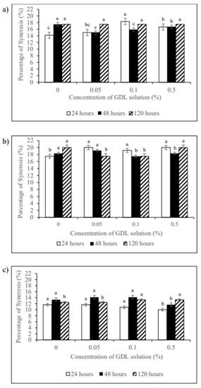 Percentage of syneresis of starch gels: (a) potato starch; (b) corn starch; (c) tapioca starch pasted with different concentrations of GDL solution. Means with different letters were significantly different (p < 0.05) regarding GDL concentration within the same storage time.