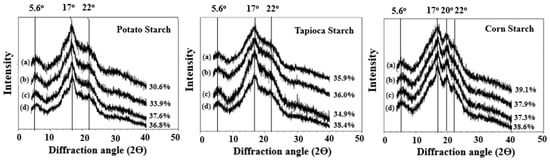 X-ray diffraction spectra of potato, tapioca, and corn starches pasted with different concentrations of GDL: (a) 0%; (b) 0.05%; (c) 0.1%; (d) 0.5%.