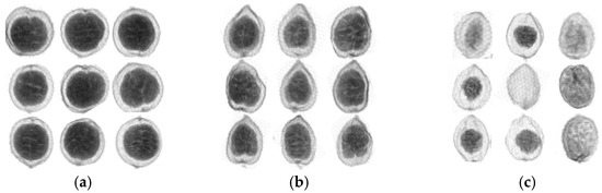 Figure 1a shows the normal sample produced in Yunnan. Meanwhile, Figure 1b shows the X-ray image of the normal sample produced in Guangdong. The shapes of the normal samples from various origins are different. For Figure 1a, the inner seed kernel is larger than that in Figure 1b. On the contrary, the X-ray image of the defective fruit samples produced in the same location has a blurred outer contour and small or no inner nuts in Figure 1c.