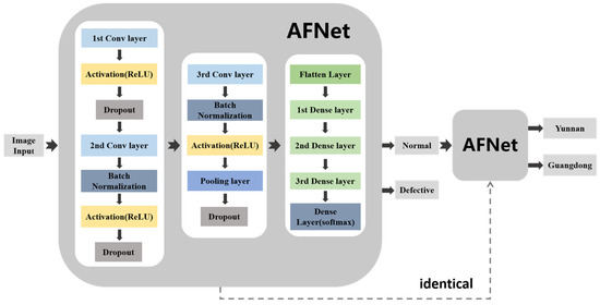 In this paper, the network structure used to detect defective Amomum villosum is the same as that used to detect the place of origin of Amomum villosum. The methodology diagram is shown in Figure 2. Firstly, the X-ray images of Amomum villosum from various places of origin were input into the network. Next, the detected defective fruit was removed from the input. The remaining normal fruits were fed into the network model to identify the place of origin. The solid arrow represents the connection of the network layer. The dotted arrow indicates that the two networks have the same structure. The proposed AFNet architecture for non-destructive testing was implemented in Python 3.7 using the Tensorflow backend. The training process was implemented on a Windows 10 system with a 3080Ti GPU.