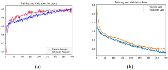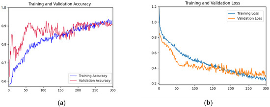As shown in Figure 5, the accuracy rate of the training set shows a gradual upward trend with the increase of iterations. The accuracy of the validation set fluctuated violently in the first 200 epochs, and gradually stabilized after 200 epochs and fitted the accuracy of the training datasets. The accuracy reached the highest value at the 300th epoch. In the first 50 epochs, the loss function curve of the training dataset decreased rapidly. The decline rate of the loss function curve of the training dataset before 300 epochs slowed down. The loss function curve of the validation dataset decreased rapidly in the first 100 epochs and tended to be gentle before 300 epochs. Overall, the curves of the validation dataset and training dataset are relatively close, indicating that there is no or slight overfitting.