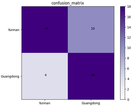 An independent dataset containing 149 X-ray images of Amomum villosum was used to validate the robustness of the proposed model. As shown in Figure 6, the confusion matrix was drawn on the basis of the obtained results. According to the confusion matrix, the accuracy, precision, and specificity of AFNet in identifying the place of origin can be calculated as 90.60%, 91.11%, and 80.39%, respectively.