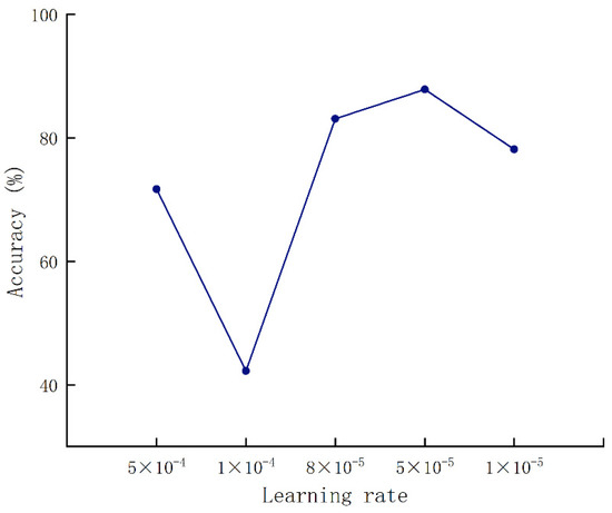 Figure 8 shows the condition of the batch size that was set to 32. As the learning rate gradually decreased, the accuracy reached the peak with the condition that the learning rate was set to 8 × 10−5. Therefore, the parameter configuration achieved optimal network performance when the batch size and the learning rate were set to 32 and 8 × 10−5, respectively.