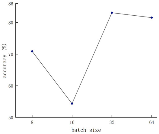 Figure 7 shows that the relationship of accuracy changed with the learning rate. When the learning rate was set to 8 × 10−5, the accuracy rate reached the highest. Then, the batch size was set to 32, followed by a batch size set to 64.