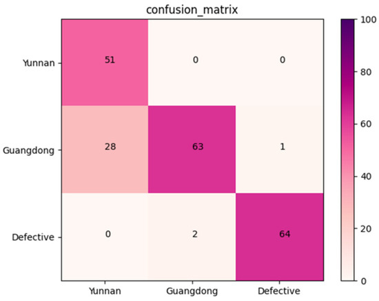 After labeling, the images of different datasets were divided into training sets, validation sets, and testing sets according to Table 1. From Table 1, it can be seen that the quality classification dataset has a total of 1600 images, which are divided into normal and defective according to the quality, with 1430 and 170 images, respectively. In addition, it is divided into training, validation, and testing sets according to the ratio of 3:1:1. The origin identification dataset contains 455 and 594 images of fruit from Yunnan and Guangdong, respectively, and only contains normal images from different origins after removing the defective images and atypical images. Finally, is the images were divided into training, validation, and test set according to the ratio of 7:2:2. The three-category classification dataset contains 452, 587, and 101 normal Yunnan, normal Guangdong, and defective images, respectively. It is divided into training, validation, and test sets according to the ratio of 4:1:1.