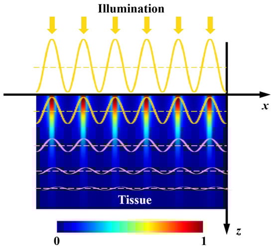 Schematic of light attenuation within a semi-infinite turbid medium under spatially modulated illumination.