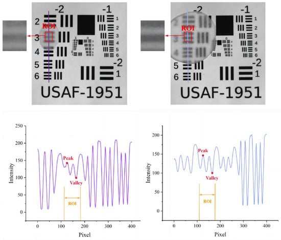 where and denote the maximum and minimum intensities of the image in ROI, respectively. Another evaluating parameter, PVR, defined as the ratio of peak and valley’s intensity [37], was also determined from the captured images: