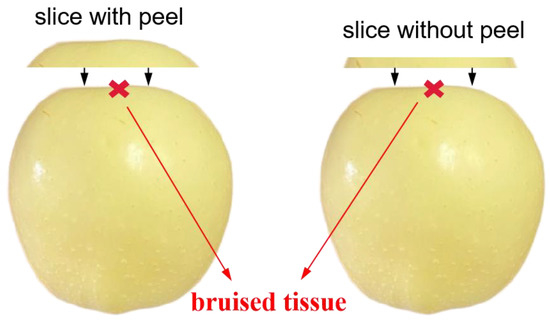 The diagram of peeled bruised apples covering with varying-thickness slices with (left) and without peels (right).