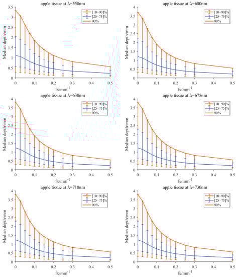 Table 1 showed the measured values of optical property parameters () of apple slices without peel using the integrating sphere technique. By inputting the optical property values manually into the developed program, the light penetration depth for the apple tissue could be simulated by consulting a scaled lookup table derived from MC simulations to the radiative transport equation in the spatial-frequency domain. Figure 7 displays the simulated results for the apple tissue at six wavelengths (550, 600, 630, 675, 710, and 730 nm), in which the median sampling depth with a [25–75]% fraction of the total measured diffuse reflectance was recognized as the critical metric for light penetration depth [33]. It was observed in the simulation results that light penetration depths increased slowly with the wavelengths, which is similar to the findings reported by Zhao et al. [17]. At 550 nm, the median sampling depth with [25–75]% was slightly smaller than that of the other five wavelengths, which was approximately in the range of 0.6–2.2 mm. It demonstrated that the 25–75% measured reflectance had the opportunity to interact with the tissue in the depth of 0.6–2.2 mm. Similarly, Lammertyn et al. [38] reported that the maximum light penetration depth in Jonagold apples at 692 nm was about 2 mm, which agrees well with the finding in this study. In the report of Binzoni et al. [39], the light propagation behavior is that the photons reaching the detectors do not go very deep and thus the information contained in the spectral images comes from a depth that does not exceed 2–3 mm. The above experimental results were all consistent with our simulation results. However, the light penetration depth (less than 400) reported by Lu and Lu [21] was much smaller than the 2.2 mm. One potential reason is the evaluation level. Lu and Lu investigated the detection depth through demodulated images, while we studied the penetration depth from the aspect of optical property estimation. Furthermore, the custom-defined acceptable resolution and contrast would also affect the detection depth. Hence, it was concluded that the light penetration depths in apple tissues were close to each other at the six wavelengths, with values of no more than 2.2 mm.