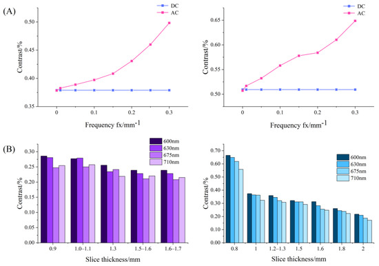 (A) Contrast variation with spatial frequencies for the direct component (DC) and amplitude component (AC) images of USAF-1951 target covered with apple slices with (left) and without peel (right); (B) histogram of contrast values for the DC images of USAF-1951 target covered with apple slice with (left) and without peel (right) in different thicknesses.