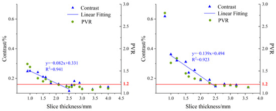 Contrast (left axis) and PVR (right axis) variation at 630 nm for direct component (DC) images of USAF-1951 target covered with different-thickness apple slices ((left) with peel; (right) without peel).